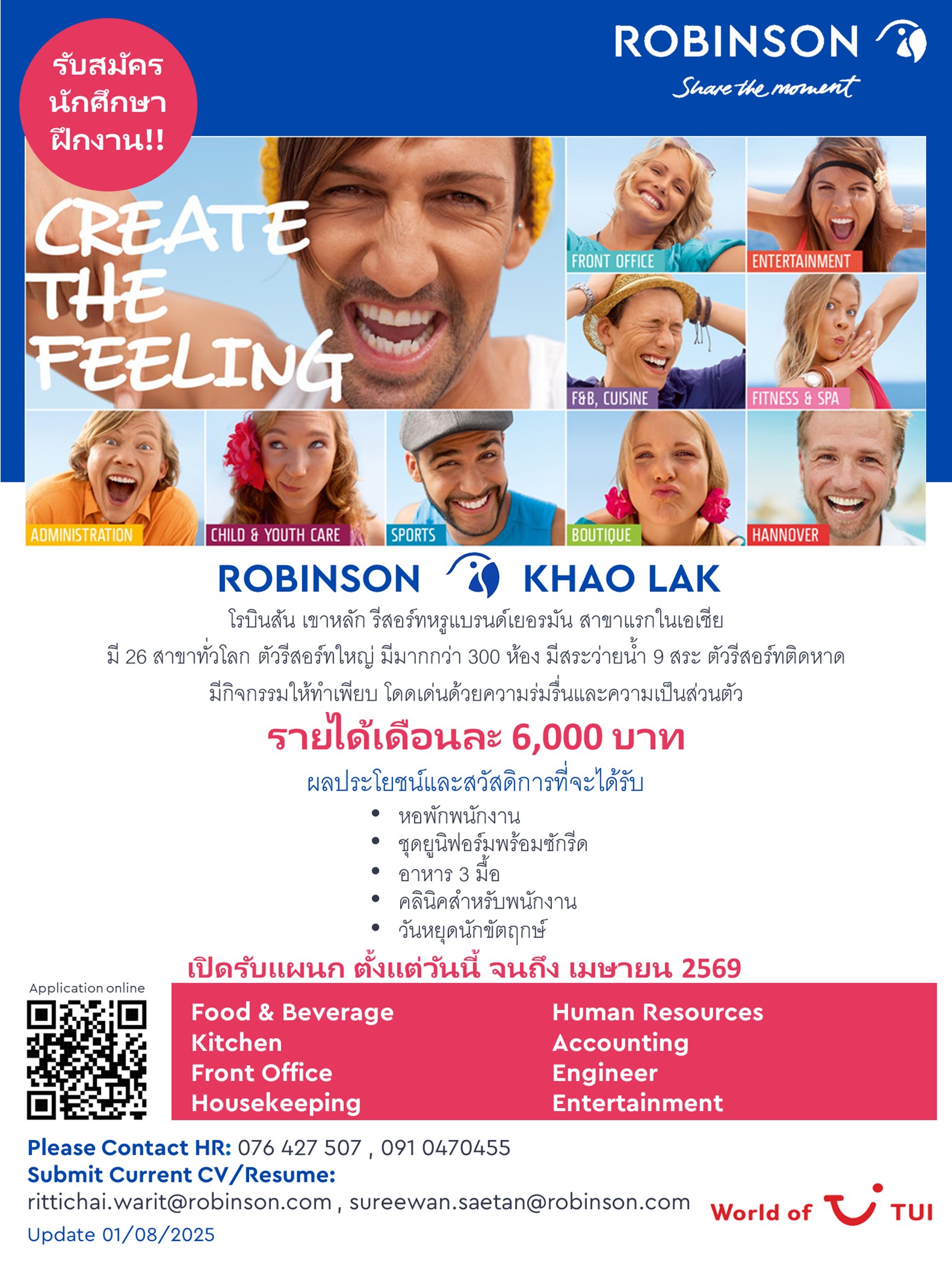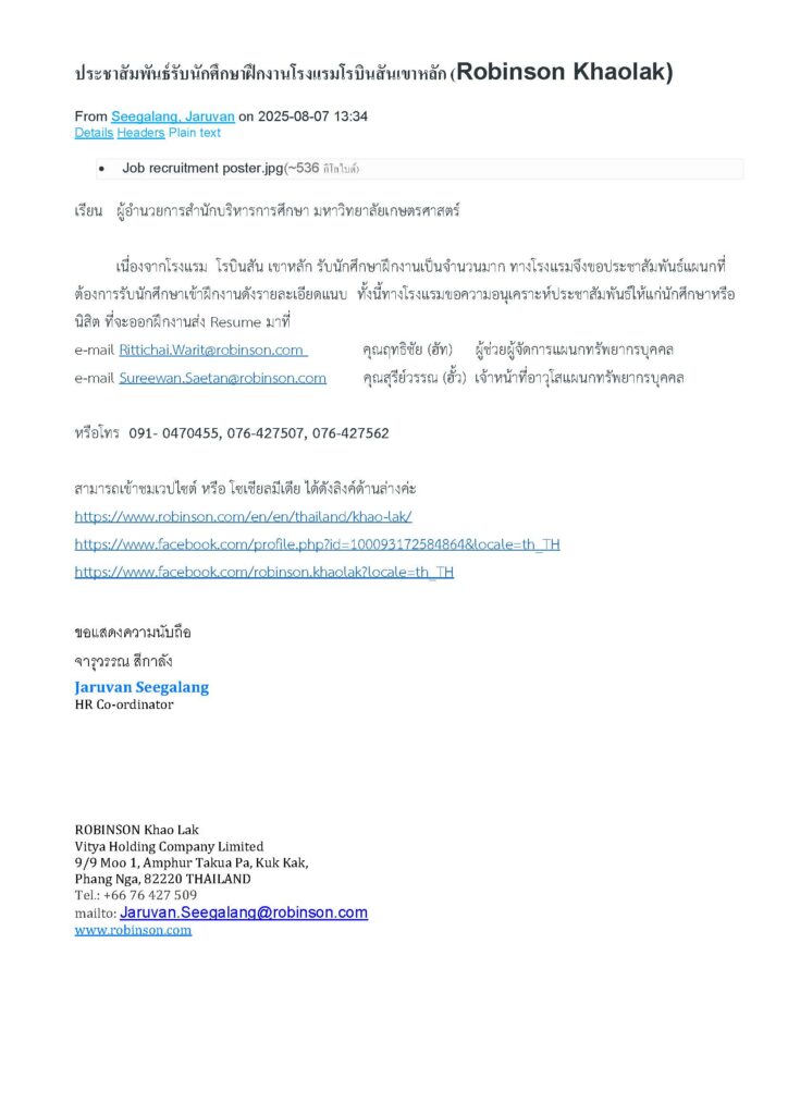 ประชาสัมพันธ์การรับนิสิตฝึกงาน/สหกิจศึกษา ของ โรงแรมโรบินสันเขาหลัก ซึ่งเป็นแบรนด์เยอรมัน สาขาแรกในเอเชีย