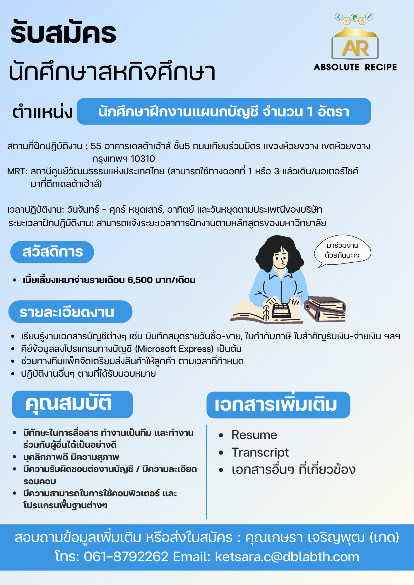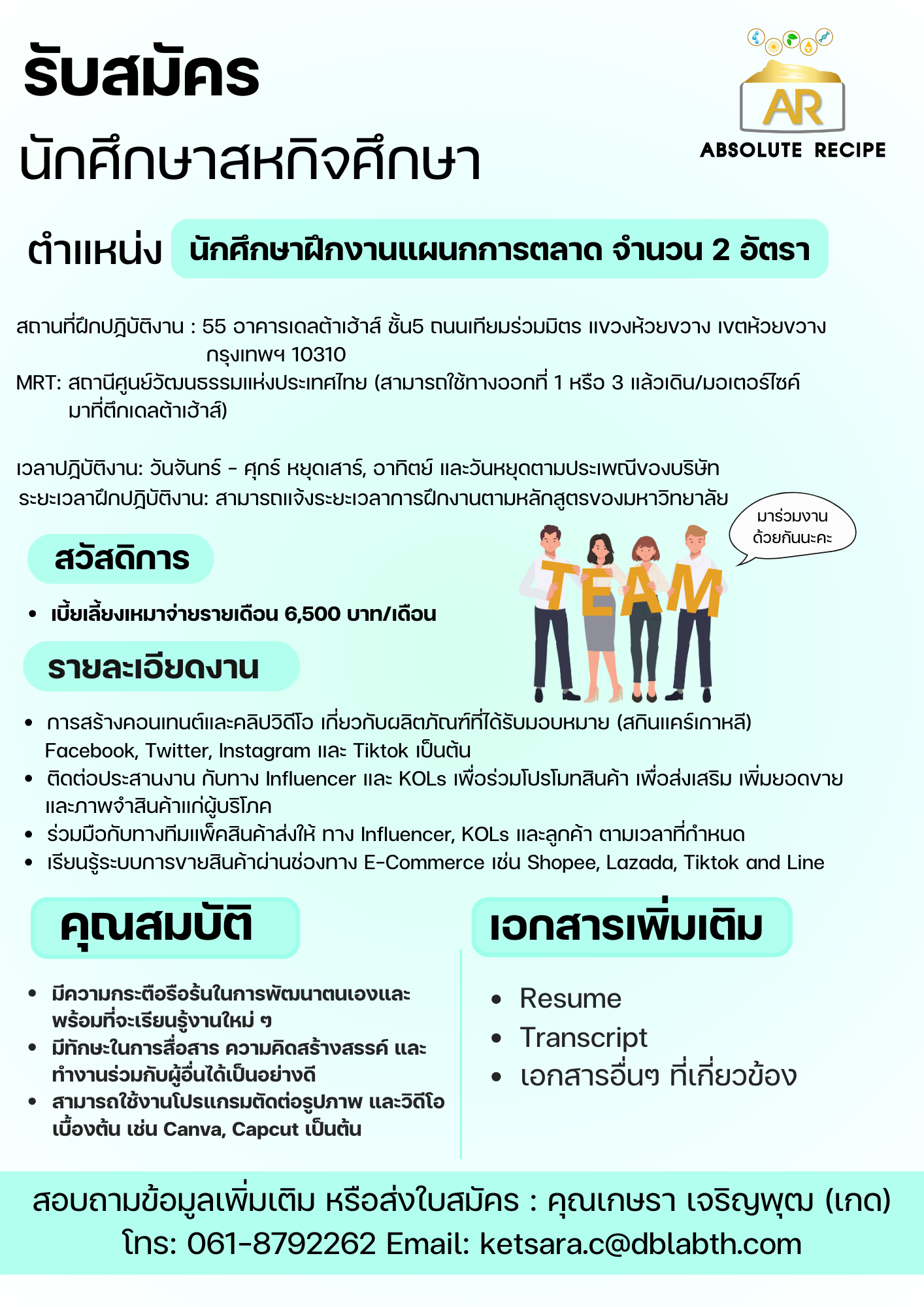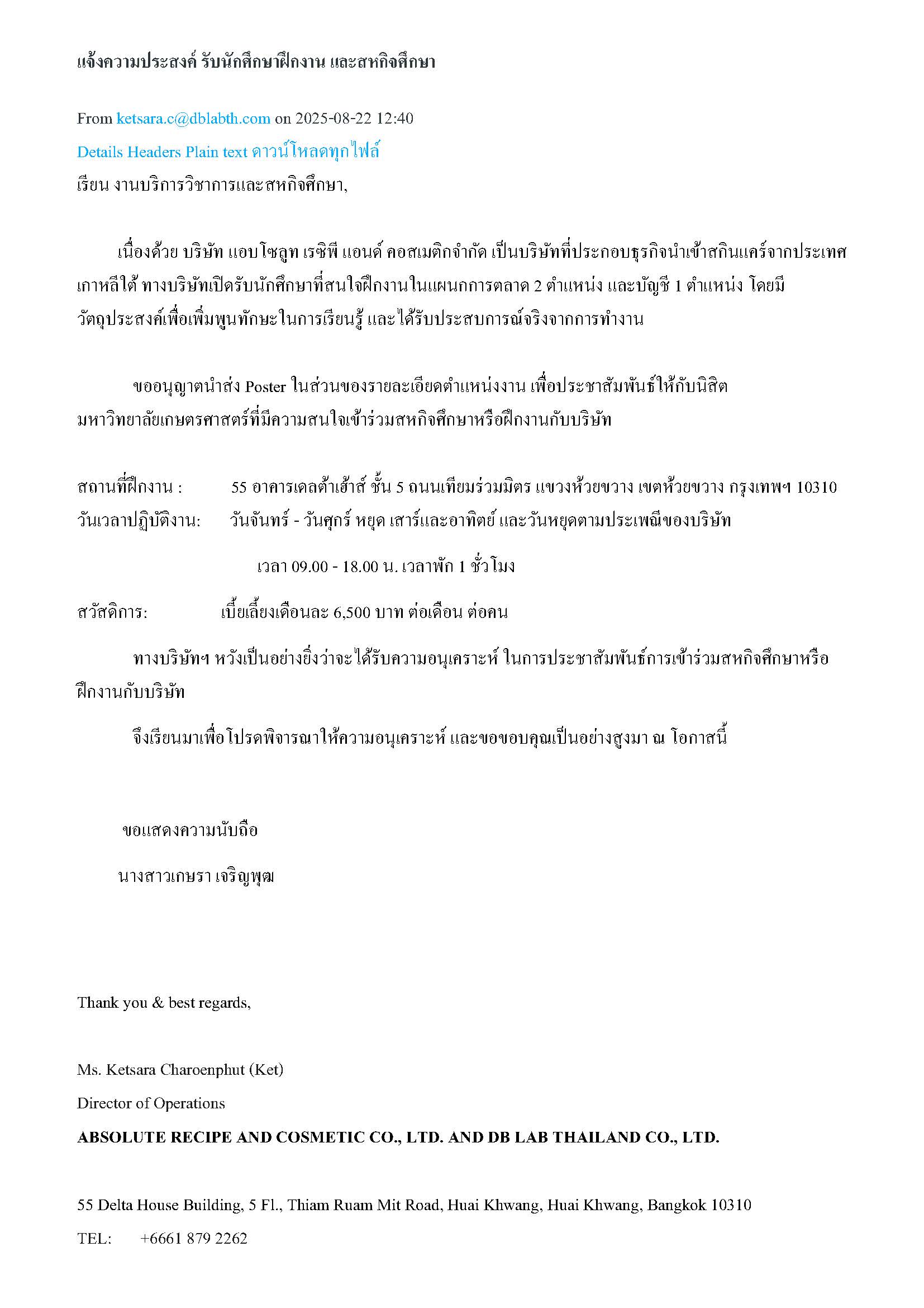 นิสิตที่สนใจสถอบถามรายละเอียดเพิ่มเติมได้ที่คุณเกษรา โทร. 061 879 2262 หรือ Email: ketsara.c@dblabth.com