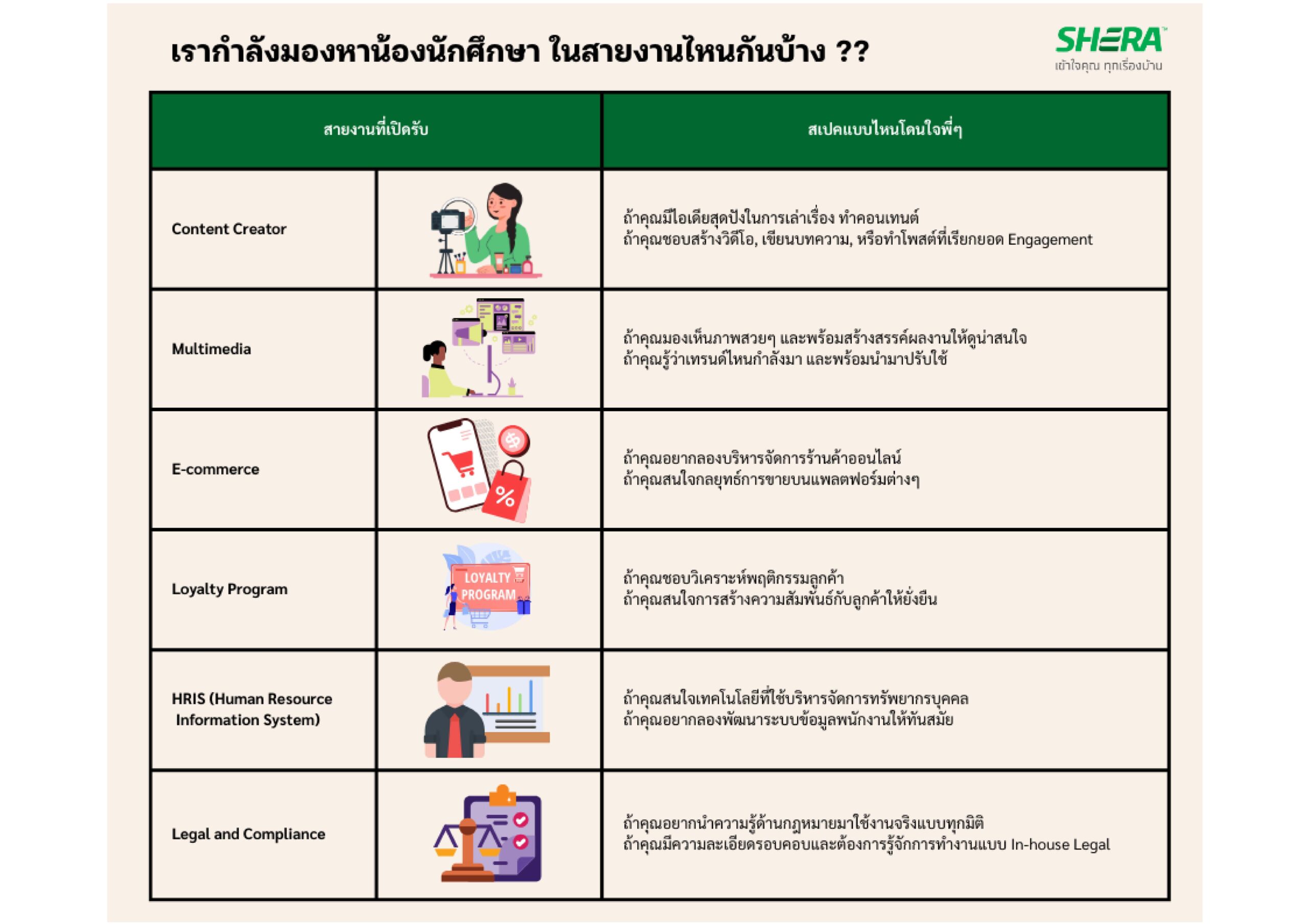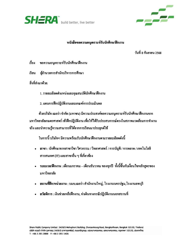 นิสิตที่สนใจสามารถสอบถามรายละเอียดเพิ่มเติมได้ที่คุณรุ่งแสง โทร. 086-378-8061 หรือทาง Email : rungsaeng_n@shera.com