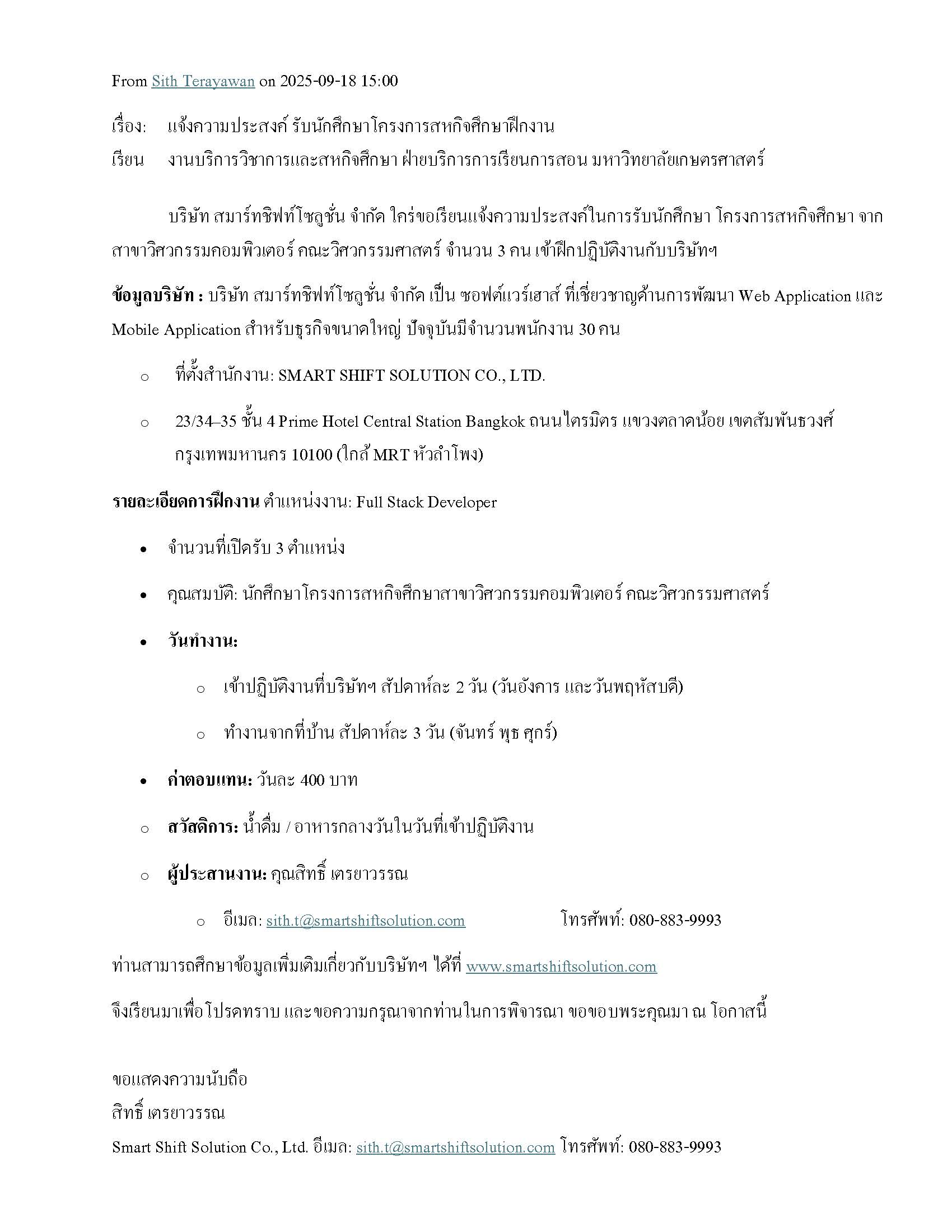 ประชาสัมพันธ์การรับนิสิตฝึกงาน / สหกิจศึกษาเข้าฝึกปฏิบัติงานกับ บริษัท สมาร์ทชิฟท์โซลูชั่น จำกัด