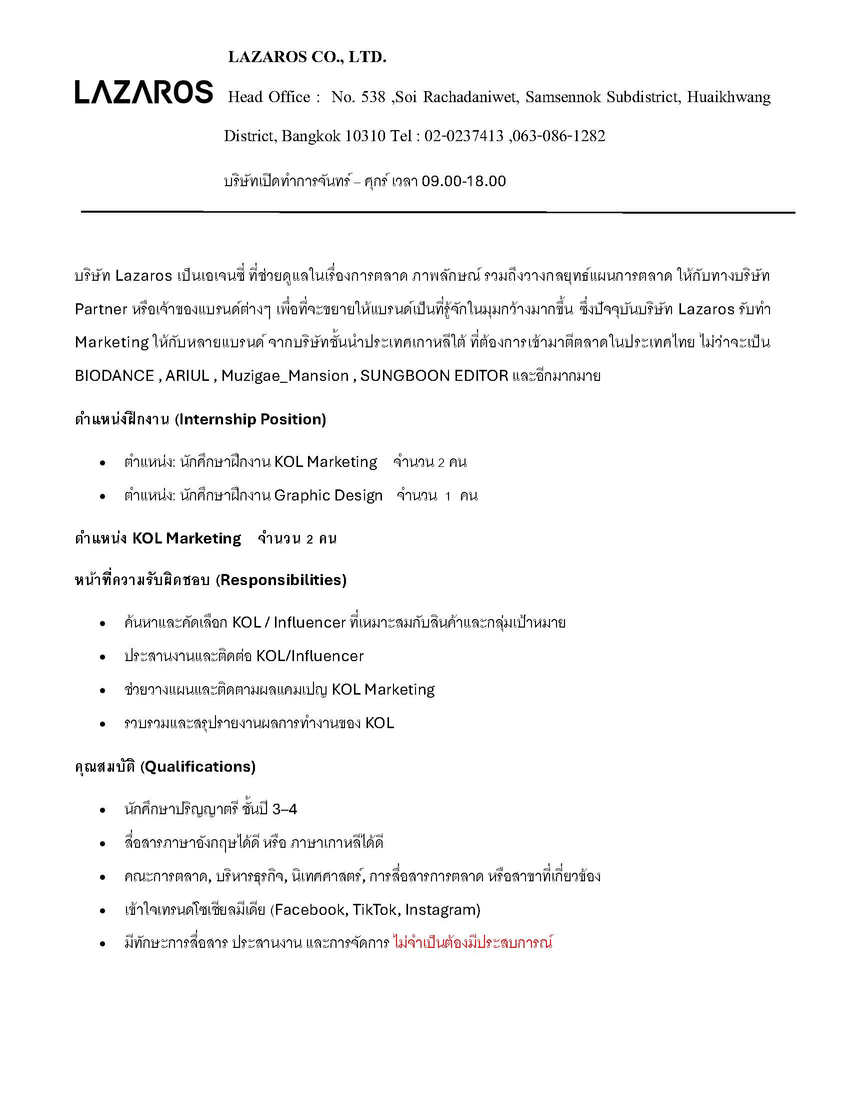ประชาสัมพันธ์การรับนิสิตฝึกงาน / สหกิจศึกษา ของ บริษัท ลาซาโรส จำกัด