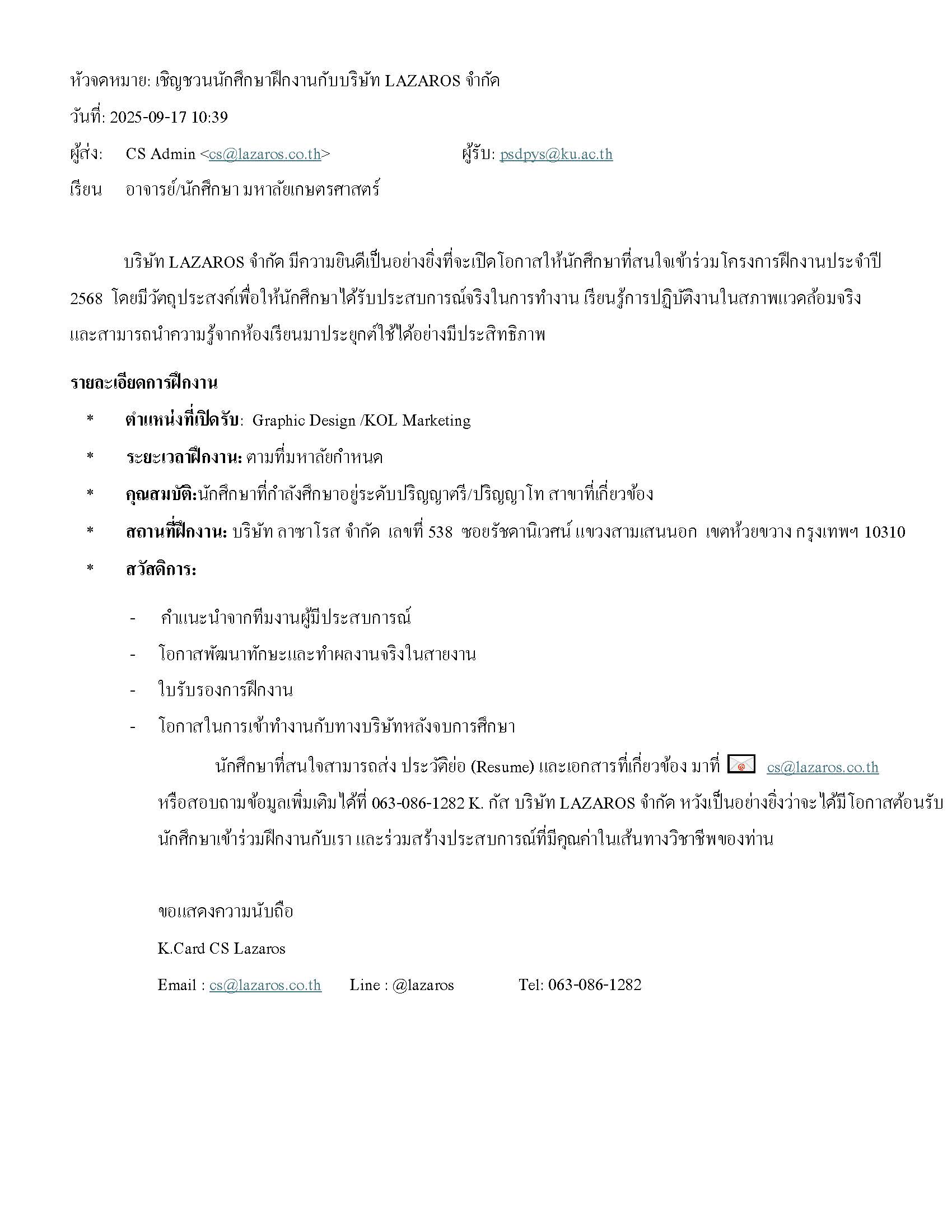 นิสิตที่สนใจสามารถส่ง ประวัติย่อ (Resume) และเอกสารที่เกี่ยวข้อง มาที่ Email: cs@lazaros.co.th