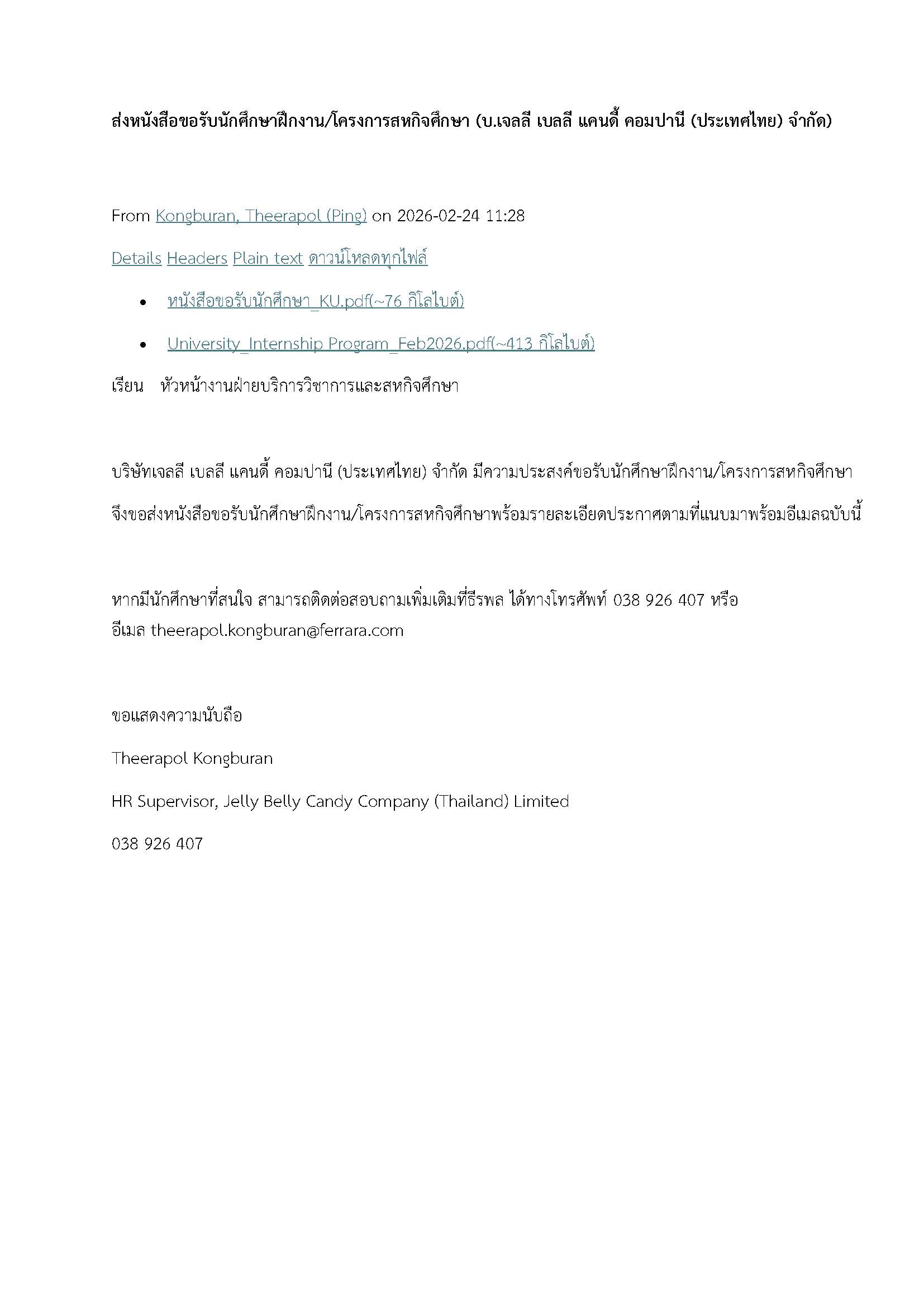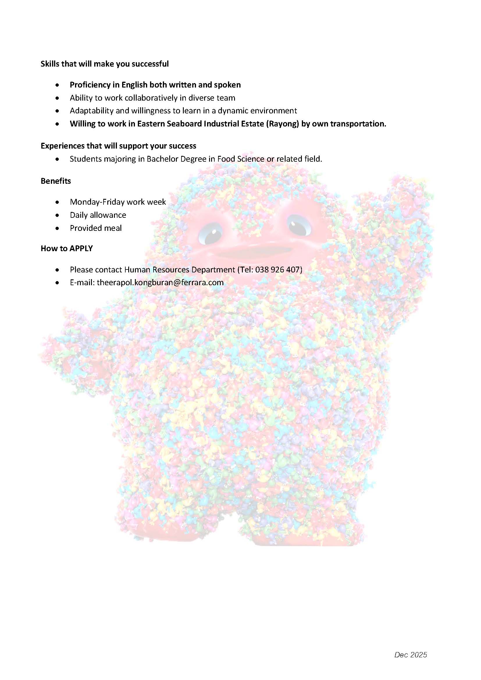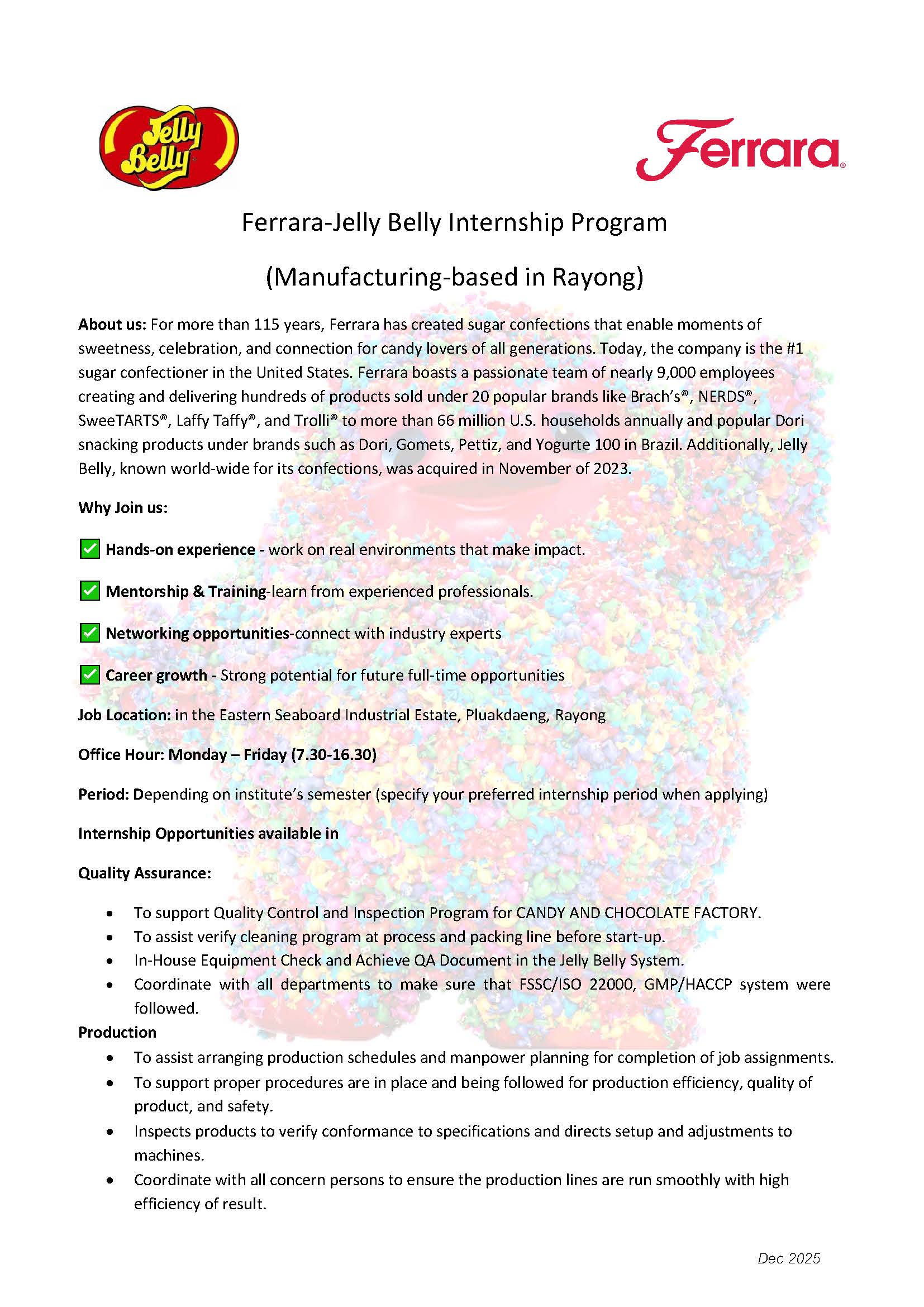 เรื่องถัดไป เรื่องก่อนหน้า Posted in บัตรนิสิต ประชาสัมพันธ์การรับนิสิตฝึกงาน/สหกิจศึกษา ของ บริษัท เจลี เบลลี แคนดี้ คอมปานี (ประเทศไทย) จำกัด ประชาสัมพันธ์การรับนิสิตฝึกงาน/สหกิจศึกษา ของ บริษัท เจลี เบลลี แคนดี้ คอมปานี (ประเทศไทย) จำกัด ซึ่งประกอบกิจการอุตสาหกรรมผลิตลูกอม เจลลี กัมมี โดยต้องการรับนิสิตในตำแหน่งดังนี้ ตำแหน่ง : นิสิตฝึกงานโครงการสหกิจศึกษา (Quality Assurance Technician, ฝ่ายรับประกันคุณภาพ และ Production Supervisor, ฝ่ายผลิต) คุณสมบัติ : กำลังศึกษา หรือใกล้สำเร็จการศึกษา ด้านเทคโนโลยีอาหาร หรือที่เกี่ยวข้อง สามารถเดินทางมาทำงานเองได้ (มีใบอนุญาติขับขี่รถยนต์หรือจักรยานยนต์) สถานที่ฝึกงาน : อ.ปลวกแดง จ.ระยอง สวัสดิการ : เบี้ยเลี้ยงและอาหารกลางวัน โดยนิสิตที่สนใจสามารถสอบถามรายละเอียดเพิ่มเติมได้ที่ฝ่ายทรัพยากรบุคคล คุณธีรพล เบอร์ 038 926 407 หรือ Email: theerapol.kongburan@ferrara.com ดังรายละเอียดไฟล์เอกสารที่แนบมาพร้อมนี้ Share this article: 0 Related Articles kkk โครงการปรับปรุงคู่มือหมวดวิชาศึกษาทั่วไป และการประชุมเชิงปฏิบัติการอาจารย์หมวดวิชาศึกษาทั่วไป