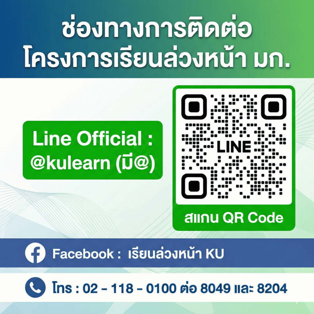 | สอบถามทั่วไปเกี่ยวกับโครงการเรียนล่วงหน้า เงื่อนไขการสมัคร โควตาต่าง ๆ การยื่นคำร้อง เปลี่ยนแปลงข้อมูลการลงทะเบียน (ชื่อผิด เลขประจำตัวประชาชนผิด หรือขอยื่นคำร้องเปลี่ยนสถานที่สอบมาที่มหาวิทยาลัยในกรณีฉุกเฉิน) | 0 2118 0100 ต่อ 8049 , 8204 kulearn@ku.th Facebook: KULearn |