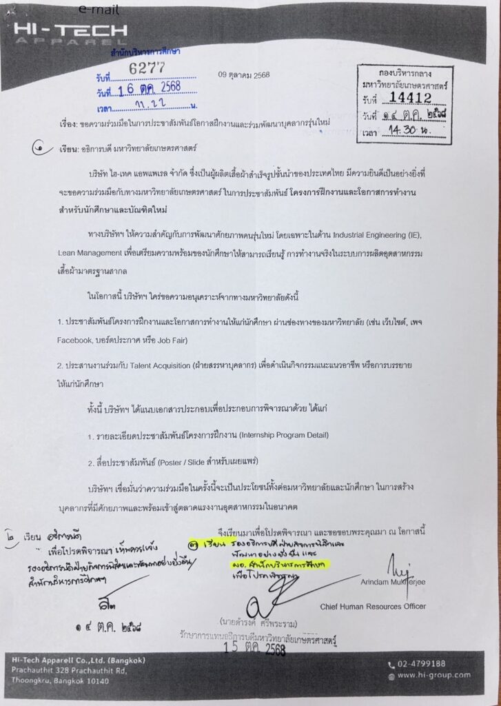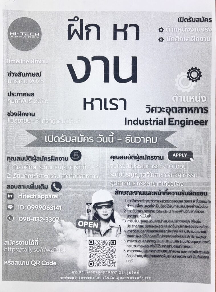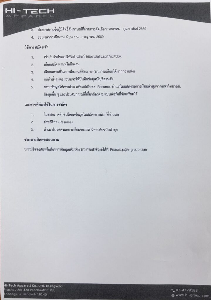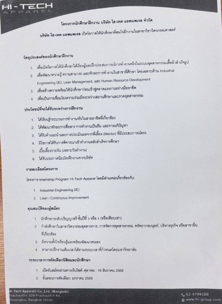 ประชาสัมพันธ์การรับนิสิตฝึกงาน และรับสมัครงาน ของ บริษัท ไฮ-เทค แอพแพเรล จำกัด