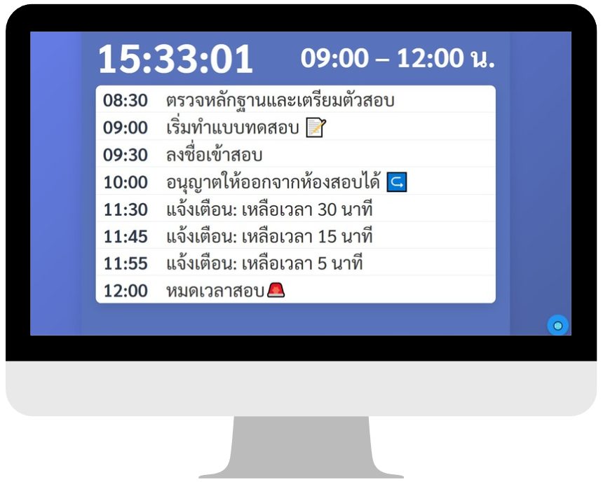สำหรับกรรมการคุมสอบ ใช้เปิดการแจ้งเตือนตารางกิจกรรมการสอบผ่านเบราว์เซอร์บนคอมพิวเตอร์ โดยจะไม่มีการพักหน้าจอระหว่างใช้งาน