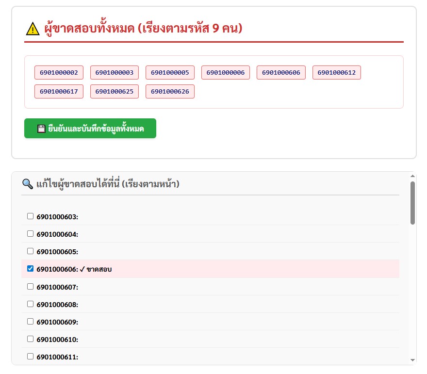 - หากระบบอ่านผิดพลาด ให้แก้ไขผู้ขาดสอบโดยเช็คขาดสอบ (✓) ให้ครบถ้วนและถูกต้อง