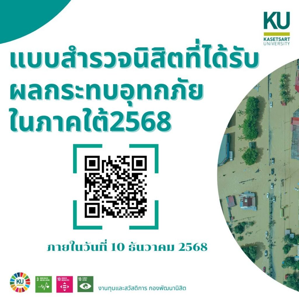 เพื่อให้การดำเนินงานด้านการช่วยเหลือเป็นไปอย่างรวดเร็ว ตรงตามความต้องการ และครอบคลุมมากที่สุด มหาวิทยาลัยขอความกรุณานิสิตหรือผู้ปกครองที่ได้รับผลกระทบจากอุทกภัยครั้งนี้ กรอกข้อมูลในแบบฟอร์มตามลิงก์ด้านล่าง ข้อมูลดังกล่าวจะช่วยให้มหาวิทยาลัยสามารถประเมินสถานการณ์และจัดสรรความช่วยเหลือได้อย่างเหมาะสมต่อไป